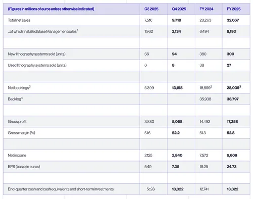 ASML realiseerde in 2025 een recordomzet van 32,7 miljard euro. De brutomarge kwam uit op 52,8 procent. Het nettoresultaat steeg naar 9,6 miljard euro. Daarmee verbeterden alle kerncijfers ten opzichte van een jaar eerder.