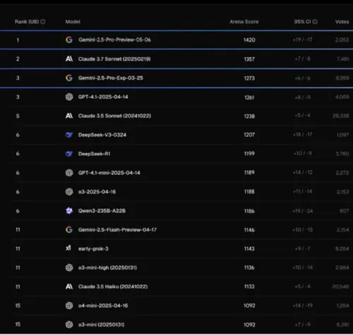 Gemini 2.5 Pro (preview van 6 mei) de toppositie veroverd op de invloedrijke AI-ranglijst van LMArena. Deze ranglijst is gebaseerd op duizenden stemrondes van echte gebruikers die AI-antwoorden direct met elkaar vergelijken.