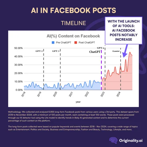Het onderzoek analyseerde 8.885 lange Facebook-berichten die tussen 2018 en november 2024 zijn verzameld. Uit de analyse bleek dat in november 2024 ongeveer 41,18% van deze berichten waarschijnlijk door AI was gegenereerd. Tussen 2023 en november 2024 bedroeg het gemiddelde percentage AI-gegenereerde berichten per maand 24,05%, wat neerkomt op een 4,3-voudige toename sinds de introductie van ChatGPT in november 2022. Dat meldt