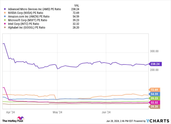 AMD's aandelen zijn veruit de slechtste waarde, met een P/E van 238. Echter, twee bedrijven springen eruit als koopjes vergeleken met hun collega's: Intel en Alphabet.