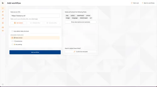 De kern van Kadoa is simpel: je geeft aan waar de gegevens vandaan moeten komen, en de tool haalt ze automatisch op. Websites, pdf’s, zelfs databases alles kan. En wat mij opviel, is hoe goed het systeem patronen herkent in de data. Je hoeft niet handmatig elk veld aan te klikken, de tool ziet meestal zelf al welke informatie je nodig hebt.